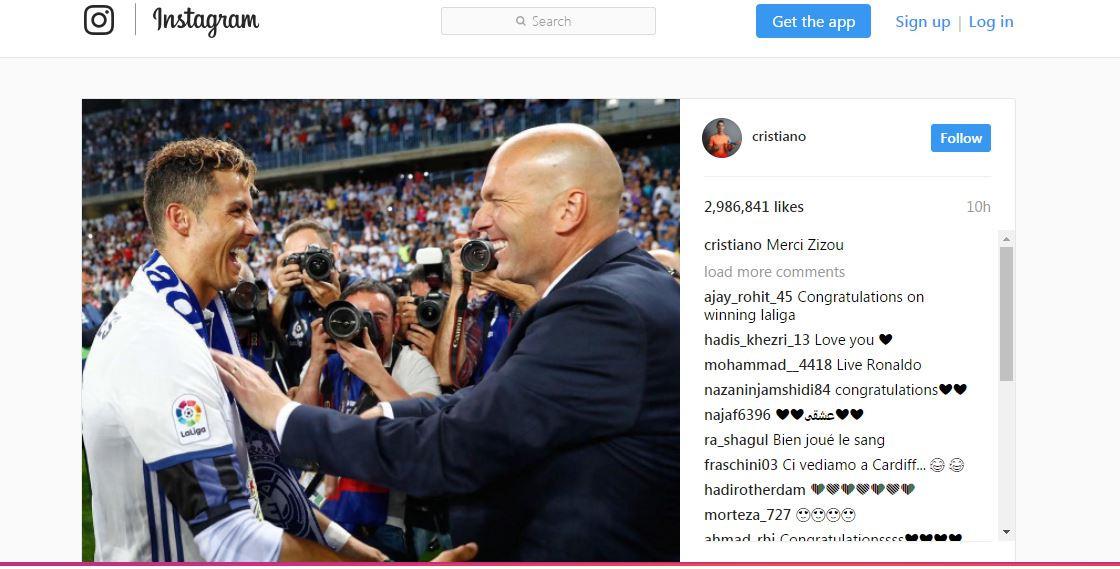 Ronaldo sendiri tetap ceria menyambut gelar juara Madrid. Tidak lupa, pemain asal Portugal itu mengucapkan terima kasih kepada Zidane lewat akun Instargram-nya.