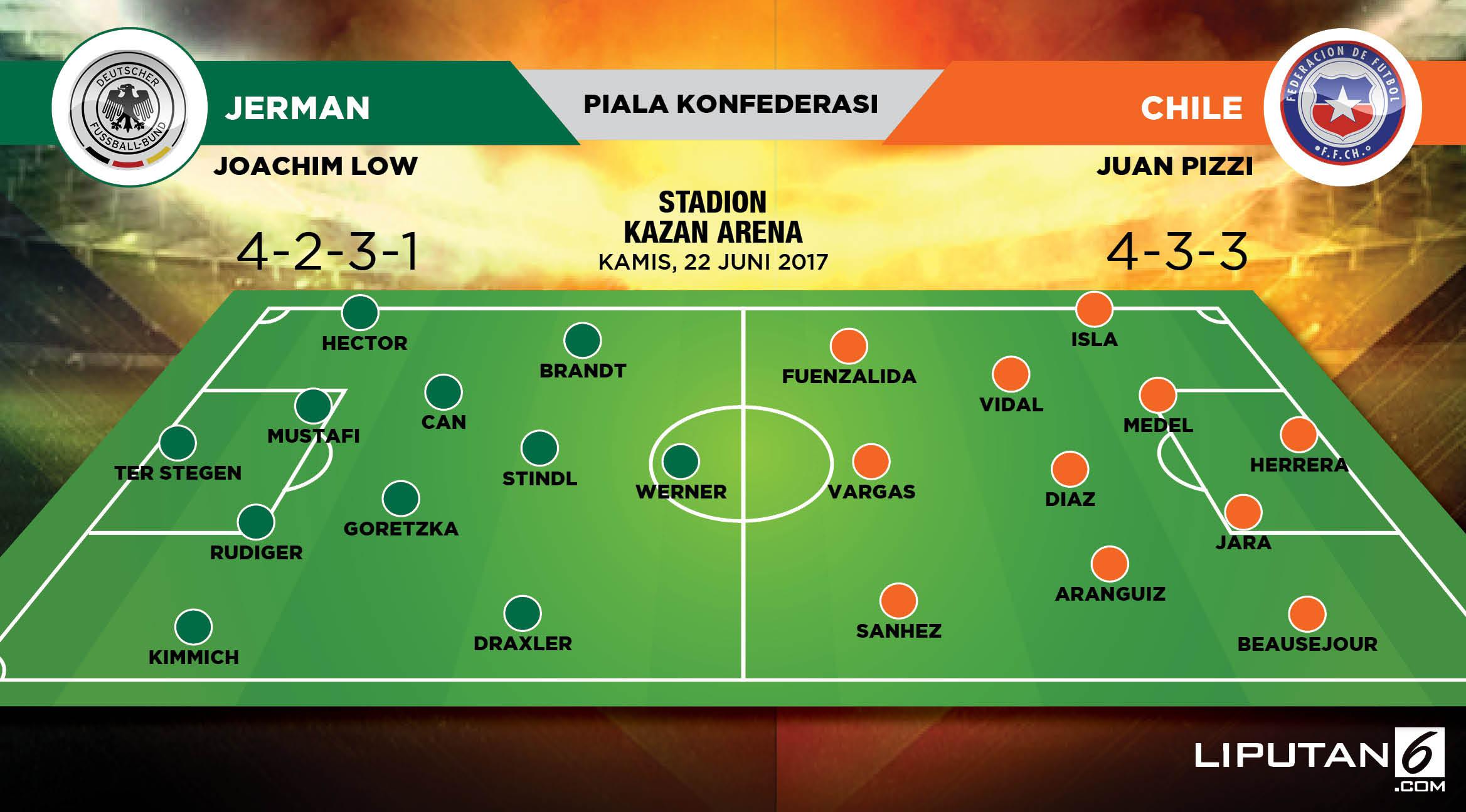Liputan6.com, Kazan - Piala Konfederasi 2017 kembali menghadirkan partai seru. Di Grup B juara dunia Jerman ditantang jawara Amerika Selatan, Chile. Pertandingan tersebut akan digelar di Kazan Arena, Kamis (22/6/2017) malam.