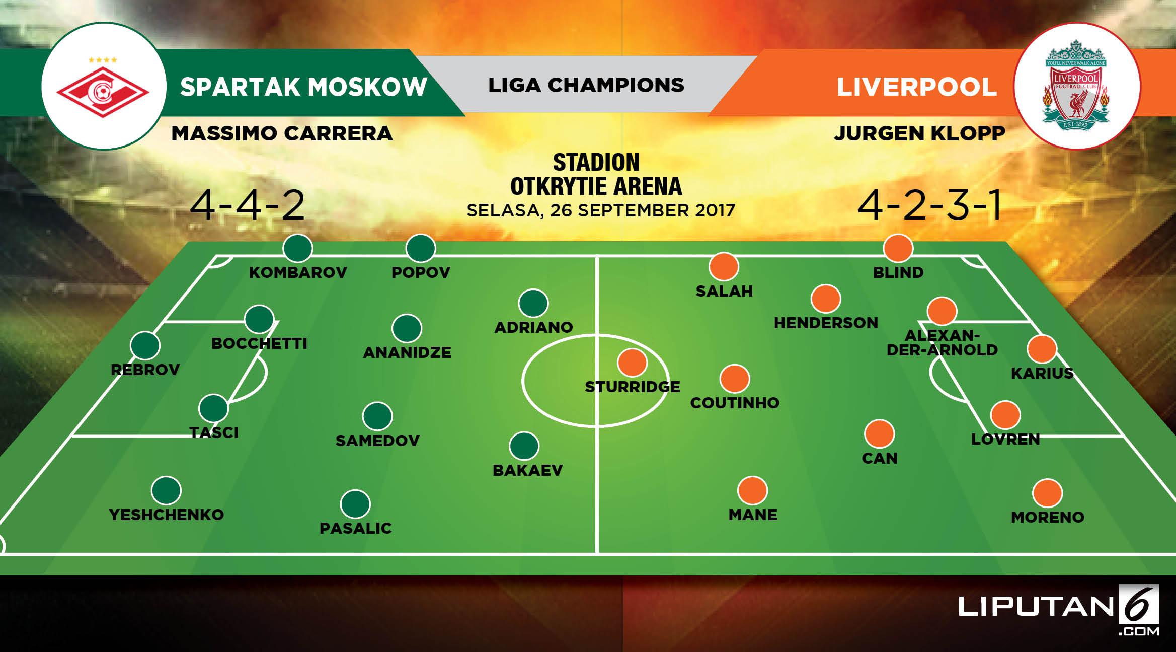 Liputan6.com, Moskow - Liga Champions memasuki match day 2 babak penyisihan grup. Salah satu pertandingan seru yang akan digelar adalah Spartak Moskow melawan Liverpool yang akan digelar di Otkrytiye Arena, Selasa (26/9/2017).
