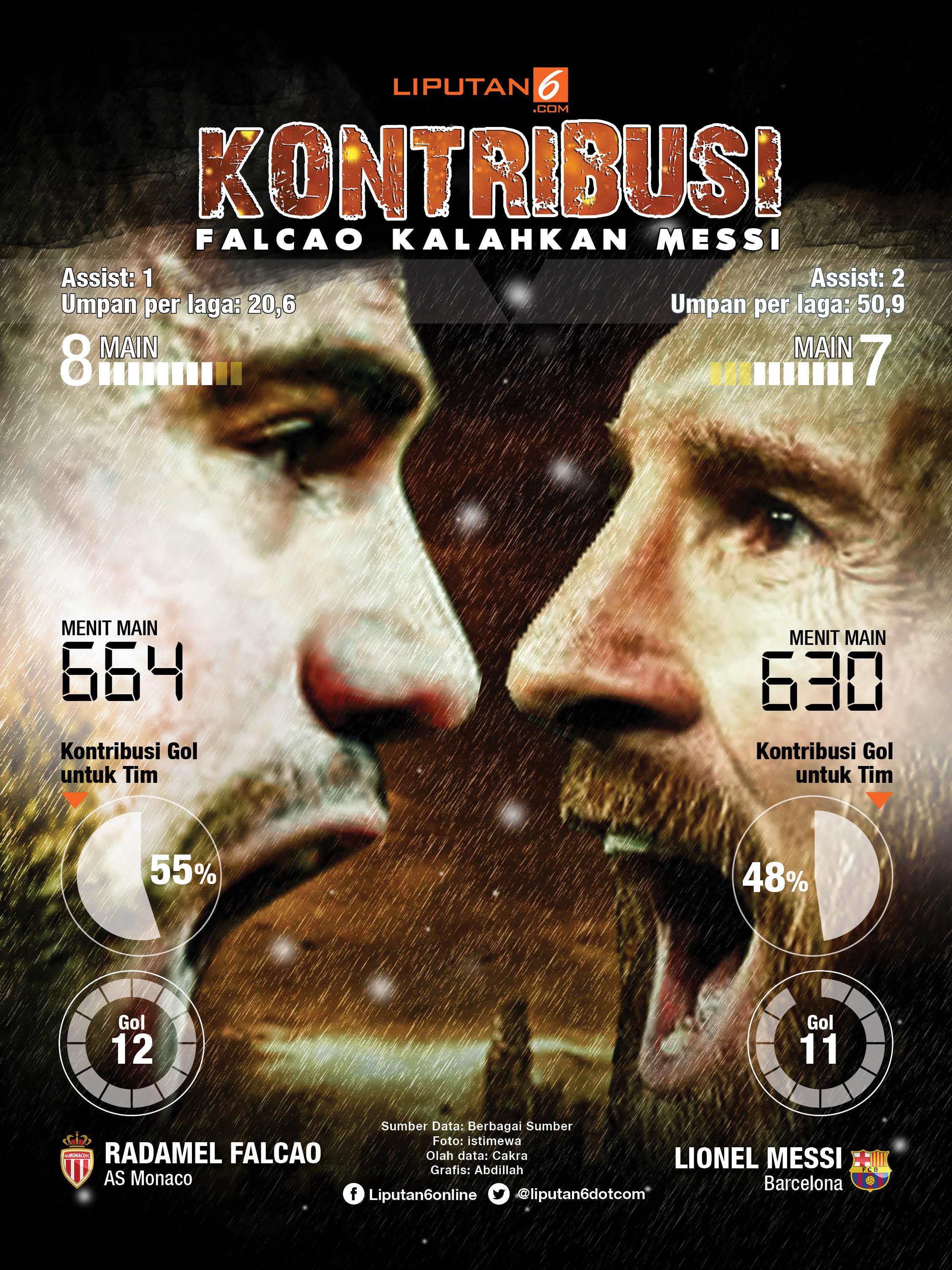 Bersama AS Monaco, Falcao sudah mencatatkan delapan pertandingan dengan durasi bermain selama 664 menit di ajang Ligue 1 musim ini. Sama seperti Messi, striker asal Kolombia itu menjadi mesin gol Monaco.