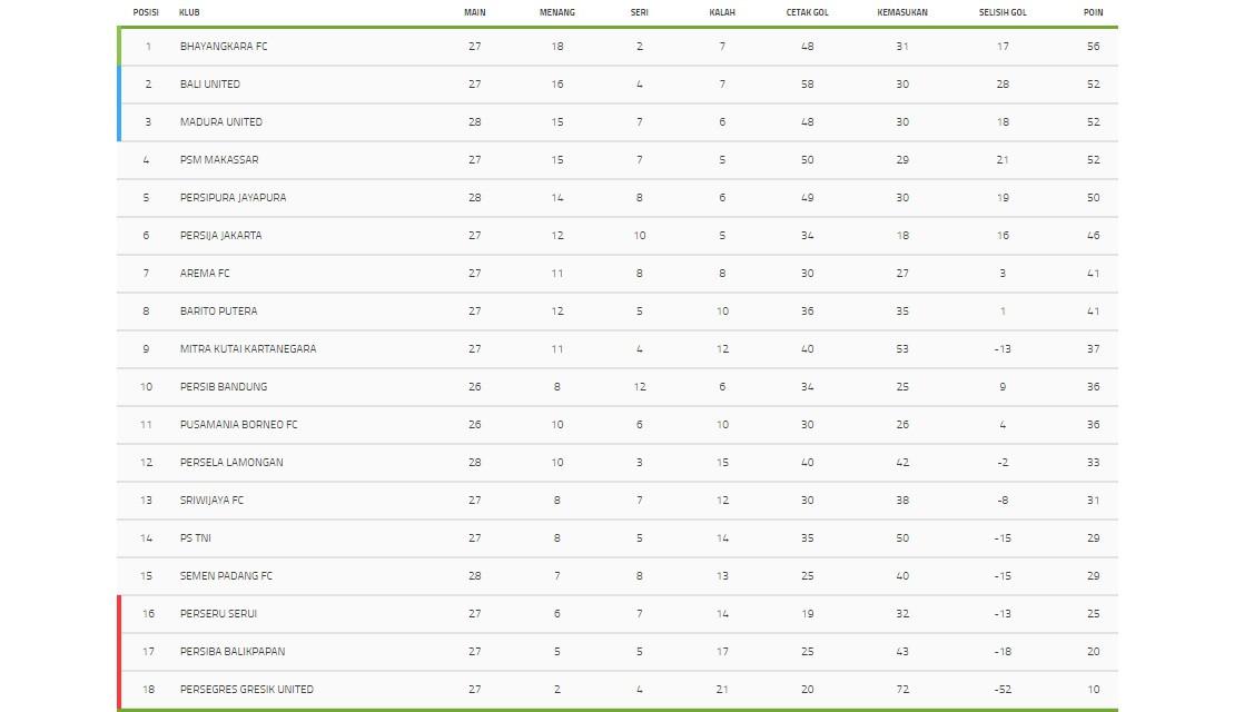 Berikut klasemen sementara Liga 1 pekan ke-28.