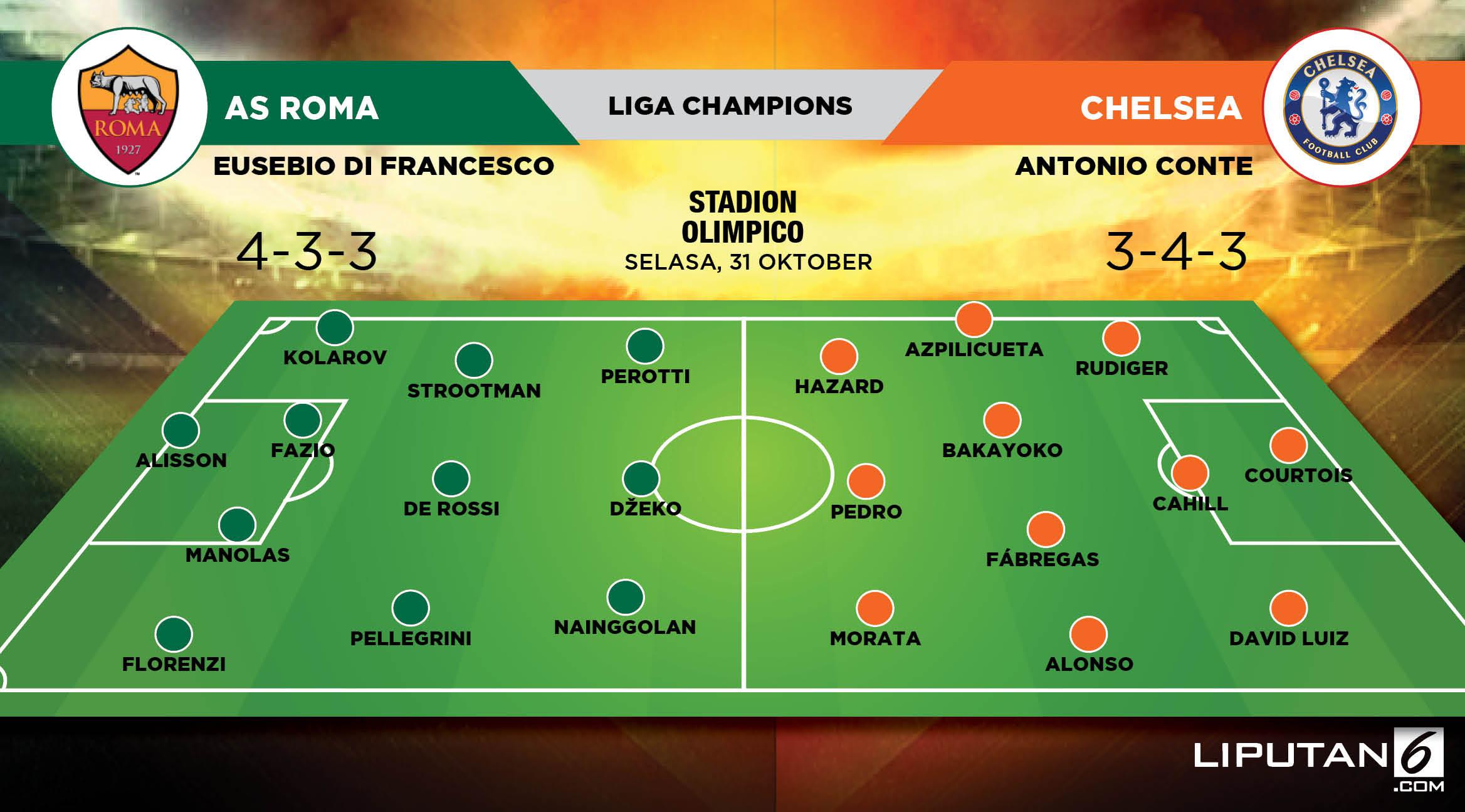Liputan6.com, Jakarta Partai seru kembali terjadi di babak penyisihan grup Liga Champions. AS Roma menjamu Chelsea di Stadion Olimpico, Selasa malam waktu setempat (31/10/2017).