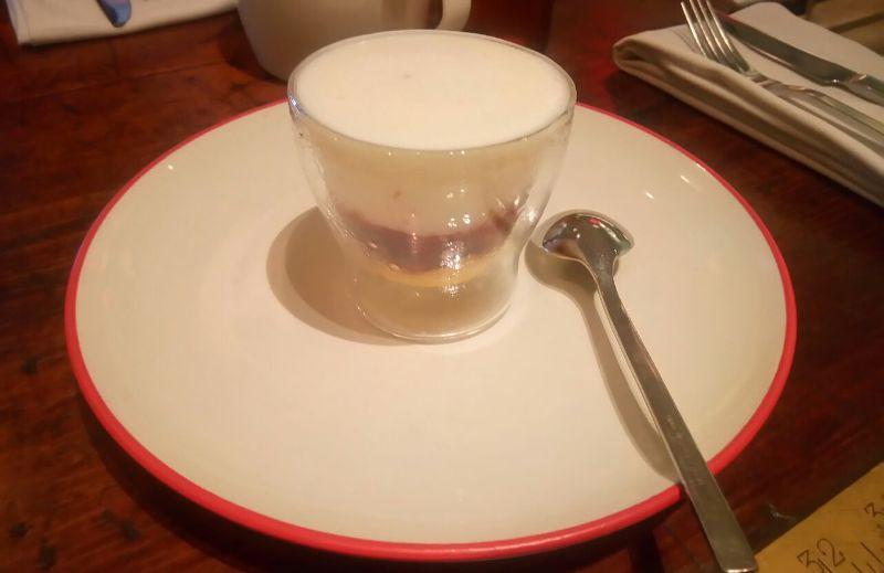 Hidangan ini disajikan dengan tambahan coconut cake yang terasa gurih. Rasa gurih kelapa di hidangan ini begitu terasa. Foam-nya juga terasa begitu lembut. Saat dilidah, Anda akan merasakan gurihnya kelapa yang berpadu dengan kopi espreso yang agak asam.