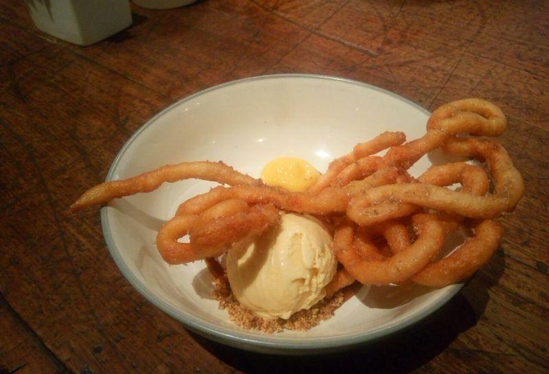 Kemudian, ada Roasted Corn Gelato. Hidangan yang mirip churros ini disajikan dengan es krim jagung dan passion fruit curd.