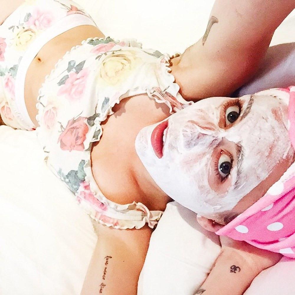 Lucy Hale juga pernah mengunggah foto dirinya sedang bersantai bersama anjingnya, memperlihatkan wajahnya sendiri yang penuh dengan krim jerawat.