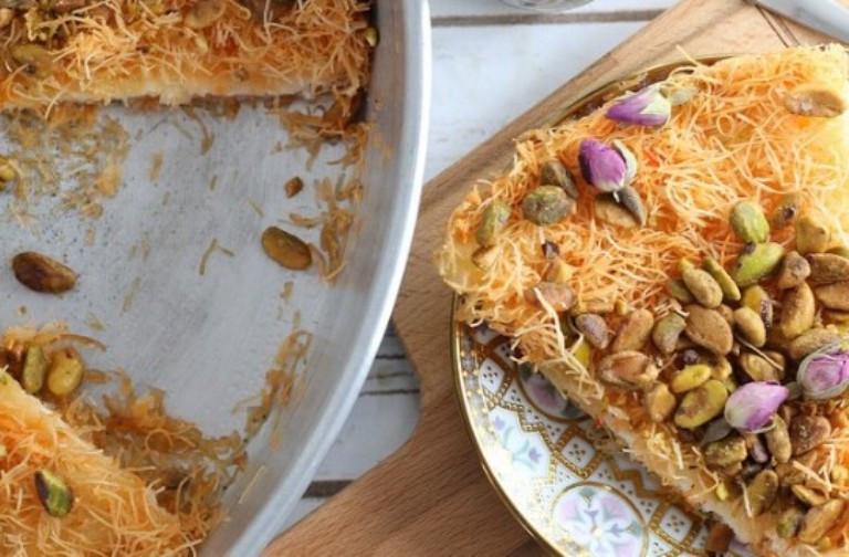 Kanafeh adalah hidangan penutup Timur Tengah klasik. Kue keju ini direndam dalam sirup gula manis. Kerak untuk makanan penutupnya terbuat dari mi tipis dan diberi hiasan dengan pistachio.