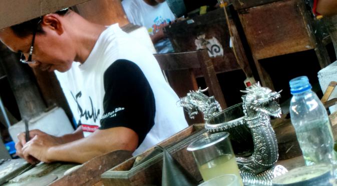 Hanya sekitar satu atau dua langkah dari tempat Priyo Salim memberi penjelasan, terdapat bangunan terbuka dimana para pekerjanya khusuk mengukir. Tapi bukan di sana titik awal dari proses penciptaan kerajinan perak. Priyo kemudian mengajak tim peserta tur menuju ke wilayah belakang workshop-nya.