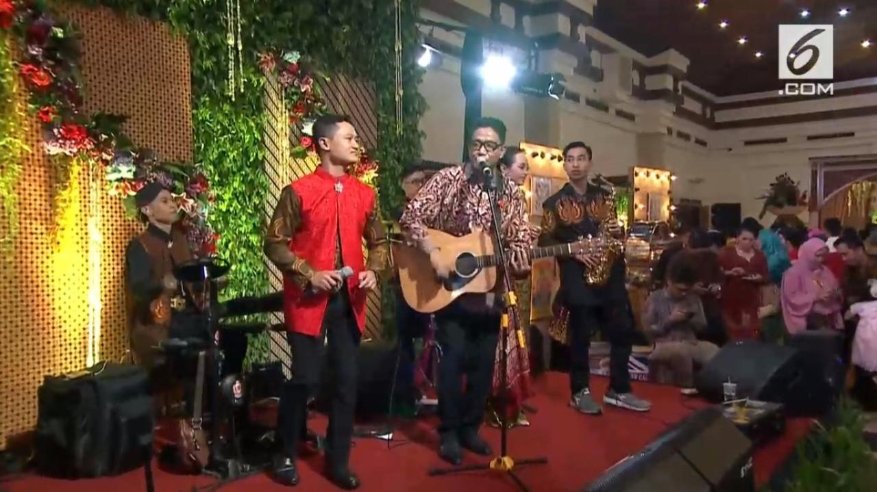 Penyanyi berusia 53 tahun ini memilih tampil dengan sederhana, memadukan kemeja batik berlengan panjang dengan celana panjang dan sepatu pantofel berwarna hitam. Kehadirannya di Gedung Graha Saba Buwana malam ini tidak hanya mengejutkan, namun juga menghibur para tamu yang hadir di acara resepsi pernikahan Kahiyang Ayu dan Bobby Nasution.