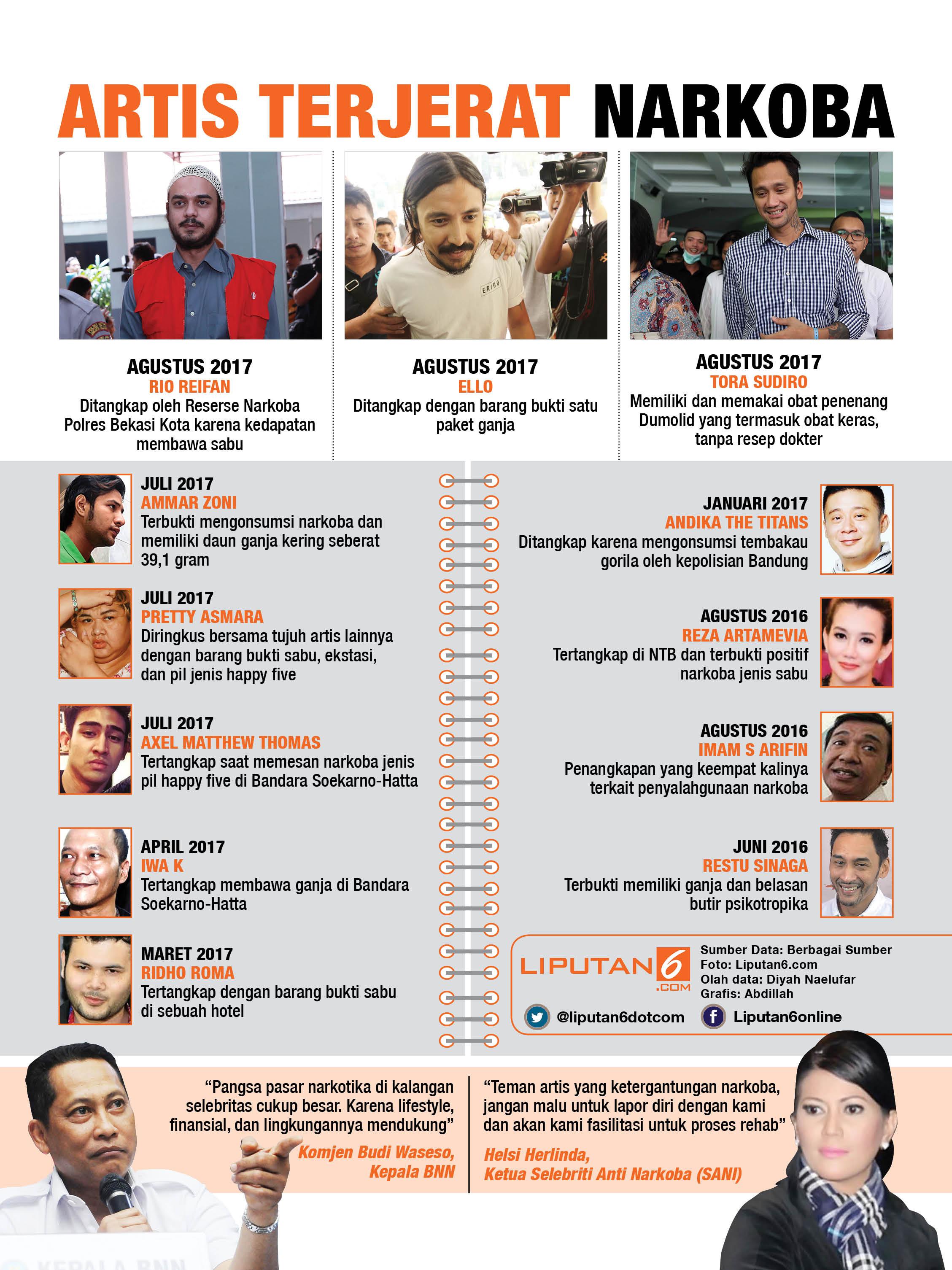 Yang terakhir dibekuk Minggu kemarin, 13 Juli 2017, sekitar pukul 20.00 WIB. Aparat dari Polres Metro Bekasi Kota menangkap pesinetron Rio Reifan. Dia kedapatan menghisap ganja saat ditilang polisi yang tengah berpatroli.