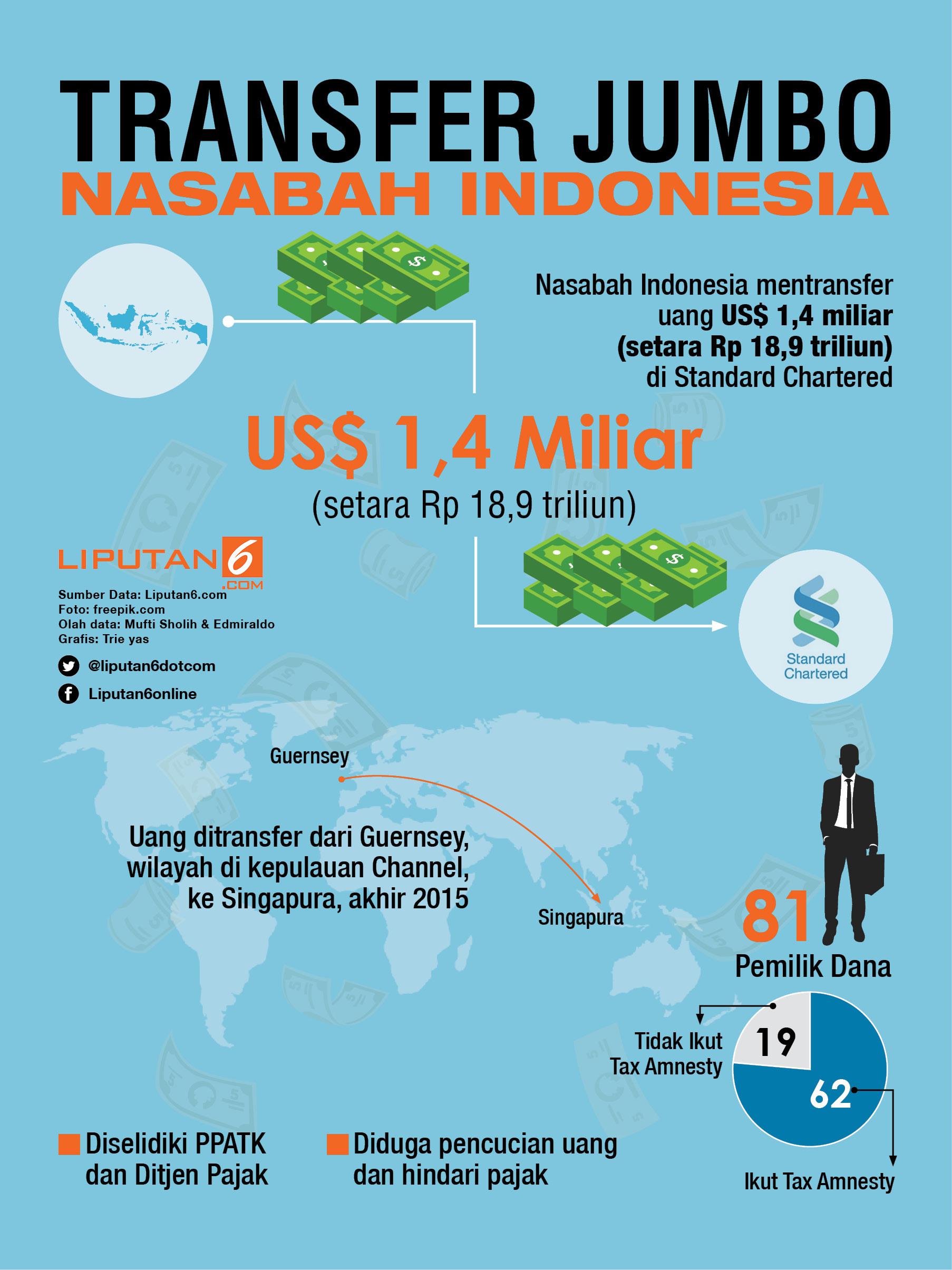 Liputan6.com, Jakarta - Pusat Pelaporan dan Analisis Transaksi Keuangan (PPATK) menerima laporan adanya transfer dana US$ 1,4 miliar atau Rp 18,9 triliun milik nasabah berkewarganegaraan Indonesia beberapa bulan lalu. Dana itu ditransfer dari Guernsey, Inggris ke Singapura melalui Standard Chartered Plc pada akhir 2015 silam.