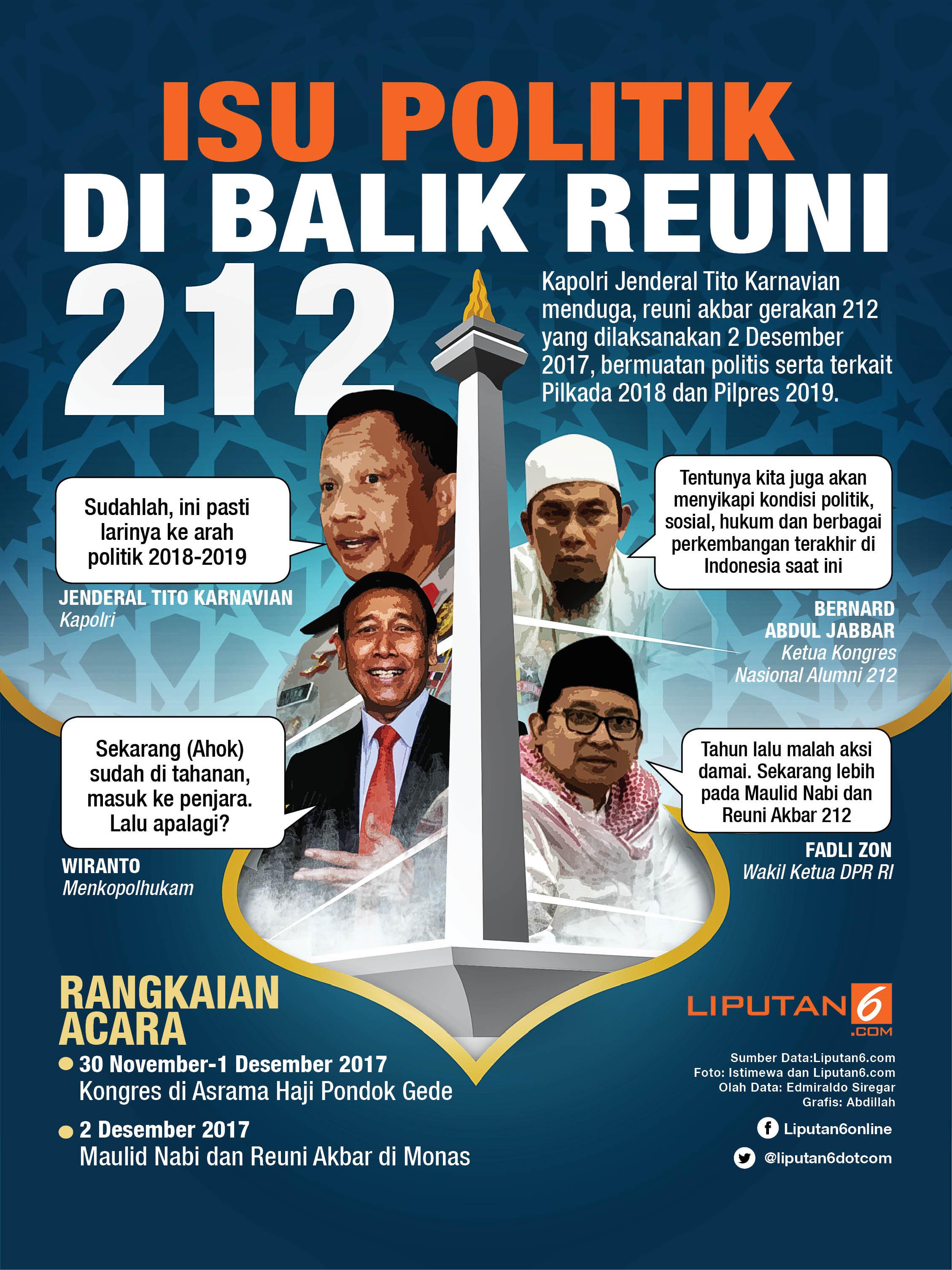 Walau begitu, beberapa kalangan menduga reuni akbar ini bermuatan politis. Kapolri Jenderal Tito Karnavian mengatakan, reuni 212 terkait dengan Pilkada Serentak 2018 serta Pilpres 2019.