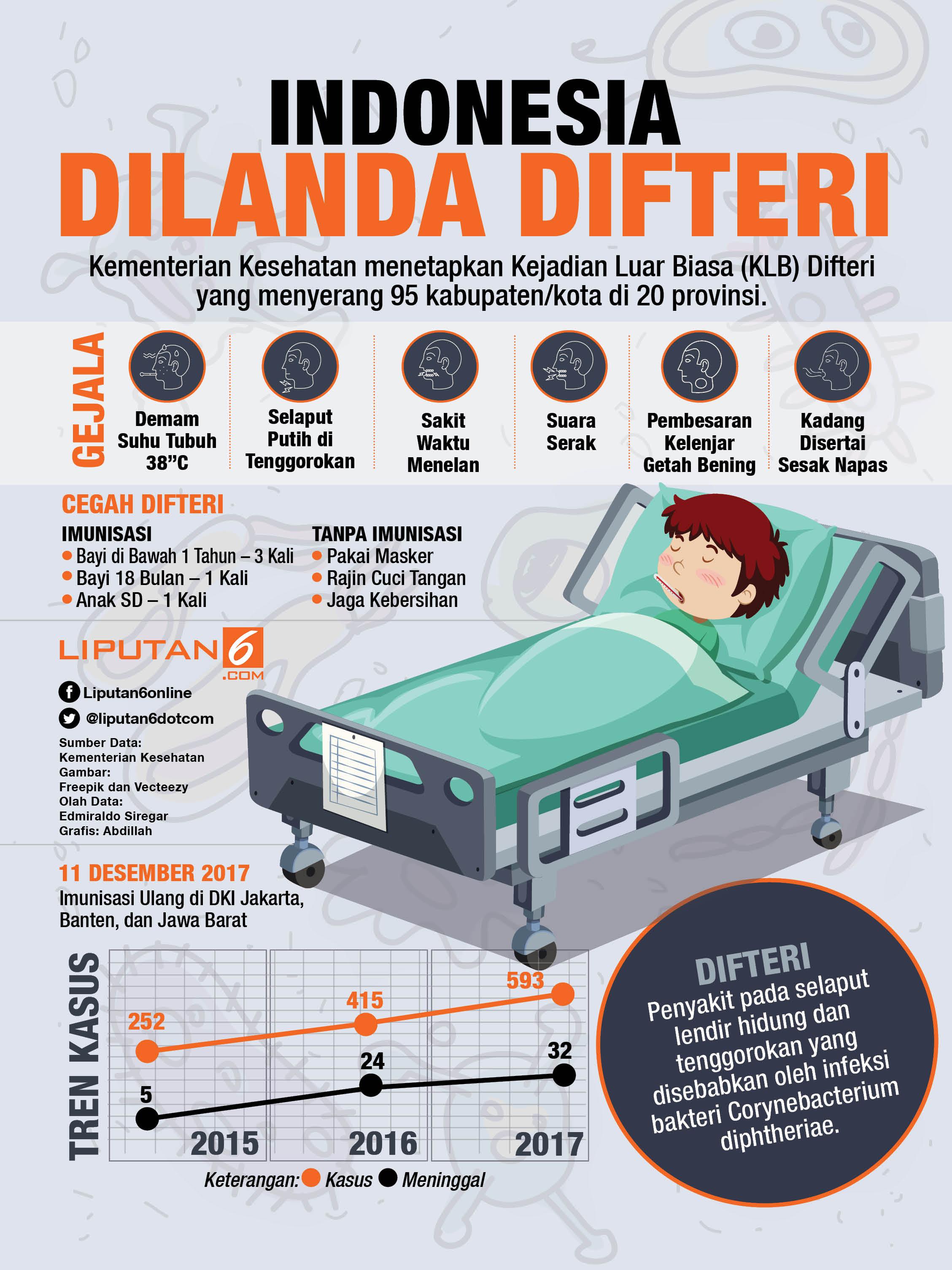 Data Kementerian Kesehatan (Kemkes) menyebut, Difteri menyerang 95 kabupaten/kota di 20 provinsi hingga November 2017.