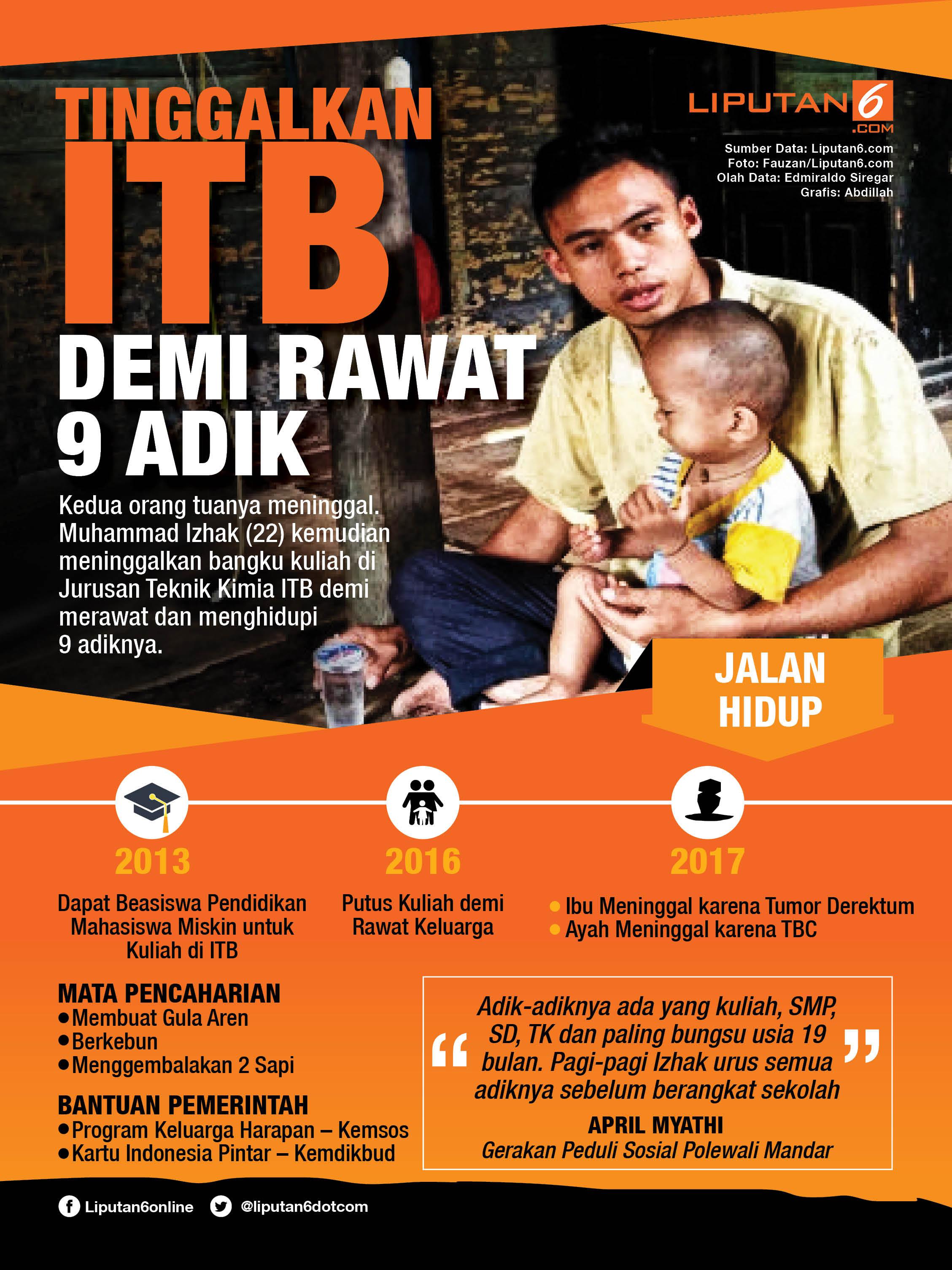 Liputan6.com, Jakarta - Kisah hidup Muhammad Izhak menggugah hati banyak orang. Mereka tergerak untuk membantu mantan mahasiswa Institut Teknologi Bandung (ITB) asal Polewali Mandar yang terpaksa putus kuliah demi merawat sembilan adiknya itu.