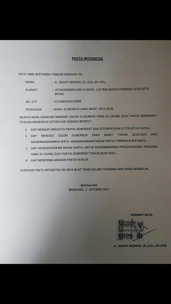 "Bang @Deddy_Mizwar_ berikut Pakta Integritas, ya Abang tandatangani, yg pd point 3 jelas menyebutkn ttg komitmen Demiz unt gerakkan mesin Partai unt memenangkan Presiden/Wakil Peesiden yg diusung olh Partai Demokrat. Dokumen ini kami dapat dari 2 sumber yg sangat dekat dg Antum," ungkap Hidayat.