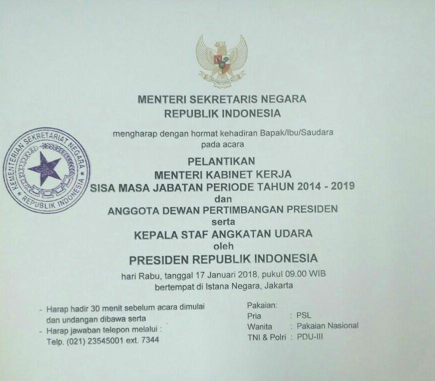 Dalam surat dengan kop Menteri Sekretaris Negara RI itu tertulis, undangan hari ini, Rabu, 17 Januari 2018, pukul 09.00 WIB bertempat di Istana Negara, Jakarta.