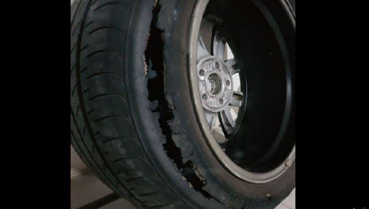 Dalam foto yang juga tersebar di broadcast tersebut, kerusakan ban akibat air keras itu cukup parah, dengan dinding ban yang pecah dan hancur.