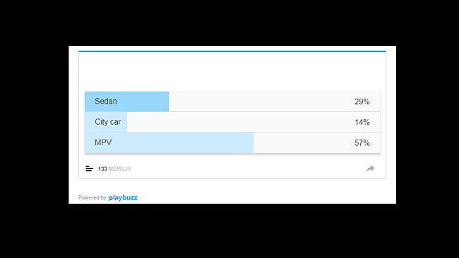 Berdasarkan hasil polling tersebut, pilihannya didominasi oleh jenis kendaraan MPV dengan perolehan suara 57%. Di urutan kedua terdapat sedan dengan perolehan 29%, dan yang terakhir adalah citycar dengan perolehan suara 14%.