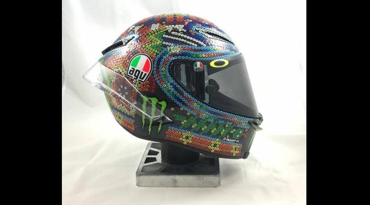 Dari tes itu, Valentino Rossi terlihat memakai baru yang dididesain oleh perancang Italia, Aldo Drudi. Helm dengan dominasi warna biru dan hijau itu memiliki motif lingkaran kecil yang berjajar mengikuti bentuk helm.