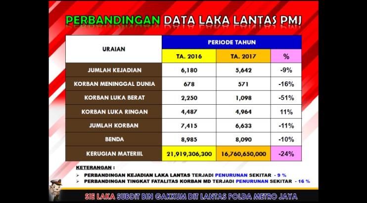 Liputan6.com, Jakarta - Direktorat Lalu Lintas Polda Metro Jaya, mengumumkan kecelakaan lalu lintas (laka lantas) di Jakarta selama 2017 mengalami penurunan sembilan (9) persen dibandingkan 2016. Jika pada 2016 laka lantas mencapai 6.180 kejadian, maka di 2017 tercatat 5.642 kejadian.