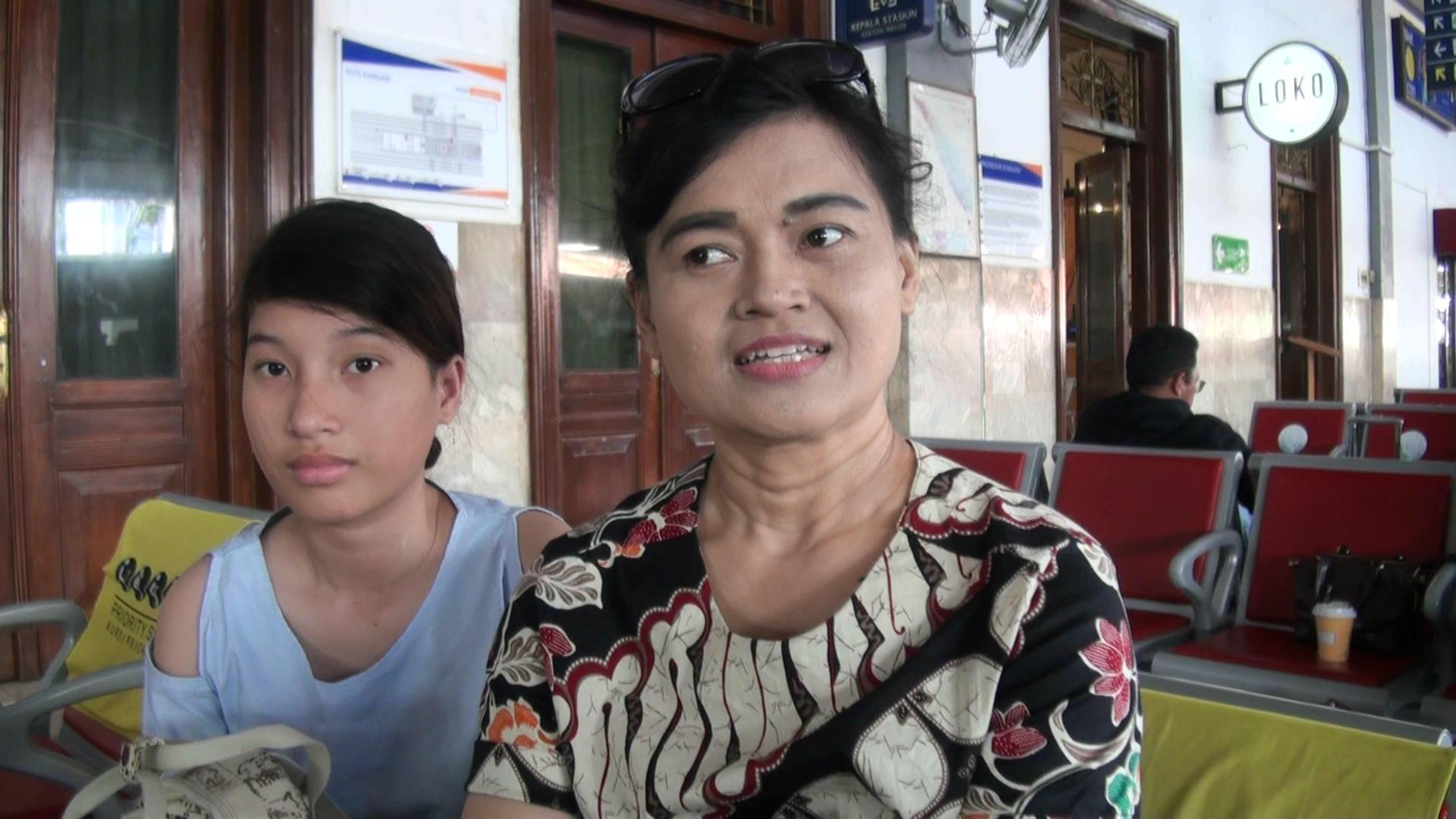 Uma Widya, perempuan asal Jakarta, terlihat menunggu kereta api di stasiun. Bersama dengan keluarganya, ia membatalkan rencana menghabiskan liburan di Yogyakarta karena tidak mendapat penginapan.