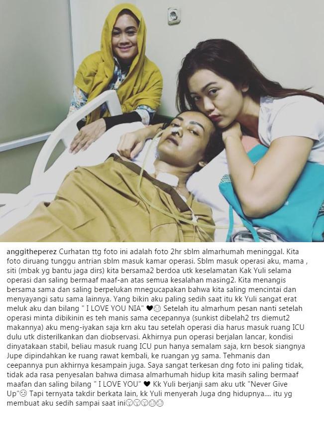 "Kk Yuli berjanji sam aku utk 'Never Give Up' Tapi ternyata takdir berkata lain, kk Yuli menyerah Juga dng hidupnya.... itu yg membuat aku sedih sampai saat ini," tulis Nia Anggia dalam foto yang disukai oleh lebih dari 23 ribu warganet itu.