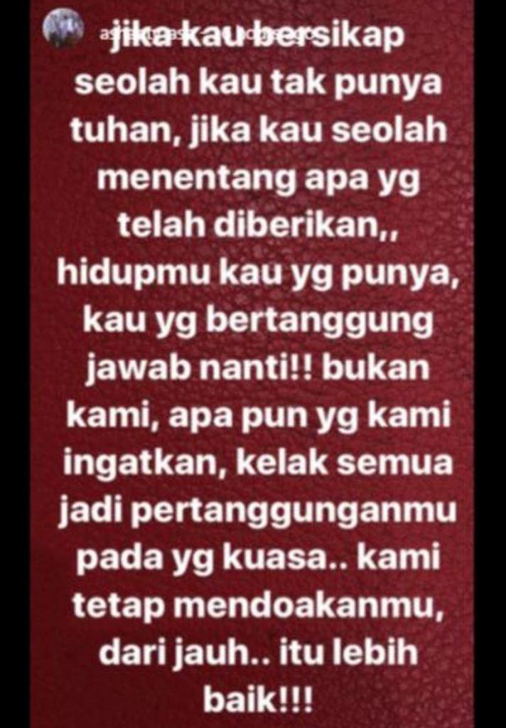 "Jika kau bersikap seolah kau tak punya tuhan, jika kau seolah menentang apa yg telah diberikan,, hidupmu kau yg punya, kau yg bertanggung jawab nanti!! bukan kami," tulis Ashanty dengan latar belakang berwarna merah.