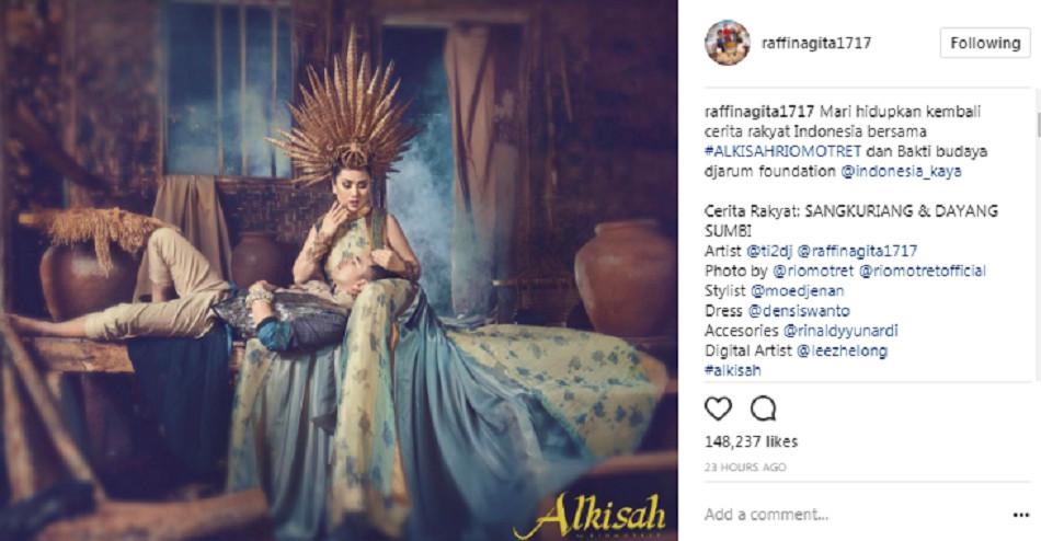 "Mari hidupkan kembali cerita rakyat Indonesia bersama #ALKISAHRIOMOTRET dan Bakti budaya djarum foundation @indonesia_kaya. Artist @ti2dj @raffinagita1717," tulis Rafffi di Instagram pribadinya, Jumat (7/7/2017).