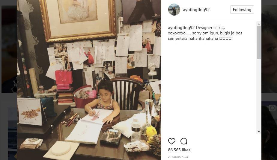Foto yang diunggah pun sama, yaitu Bilqis, buah hati Ayu Ting Ting, yang tampak duduk di meja kerja Ivan Gunawan. Buah cinta sang pedangdut dan Enji itu pun seakan sedang menggambar di sebuah buku sketsa.