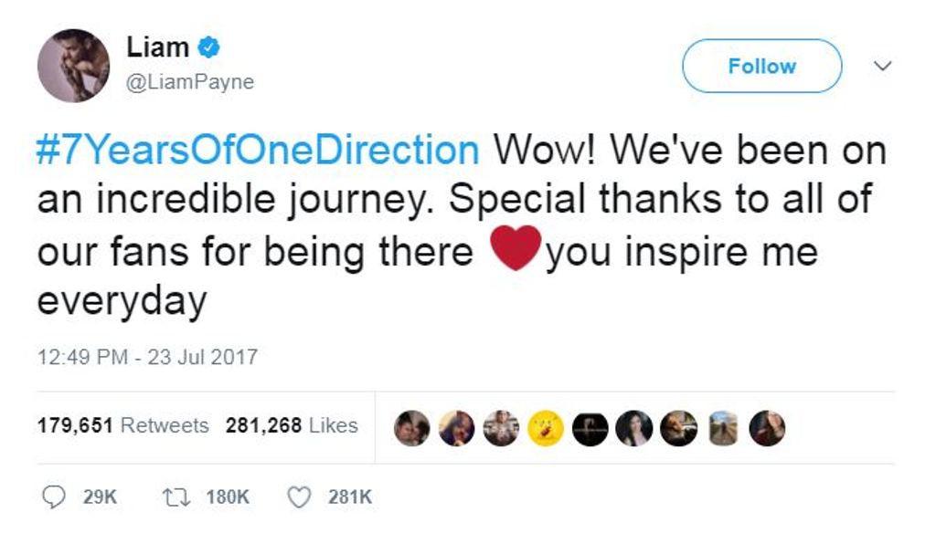 "#7YearsOfOneDirection Wow! Kami telah melewati perjalanan yang luar biasa. Terima kasih untuk semua penggemar di luar sana. Kau menginspirasiku setiap hari," tulis Liam Payne.