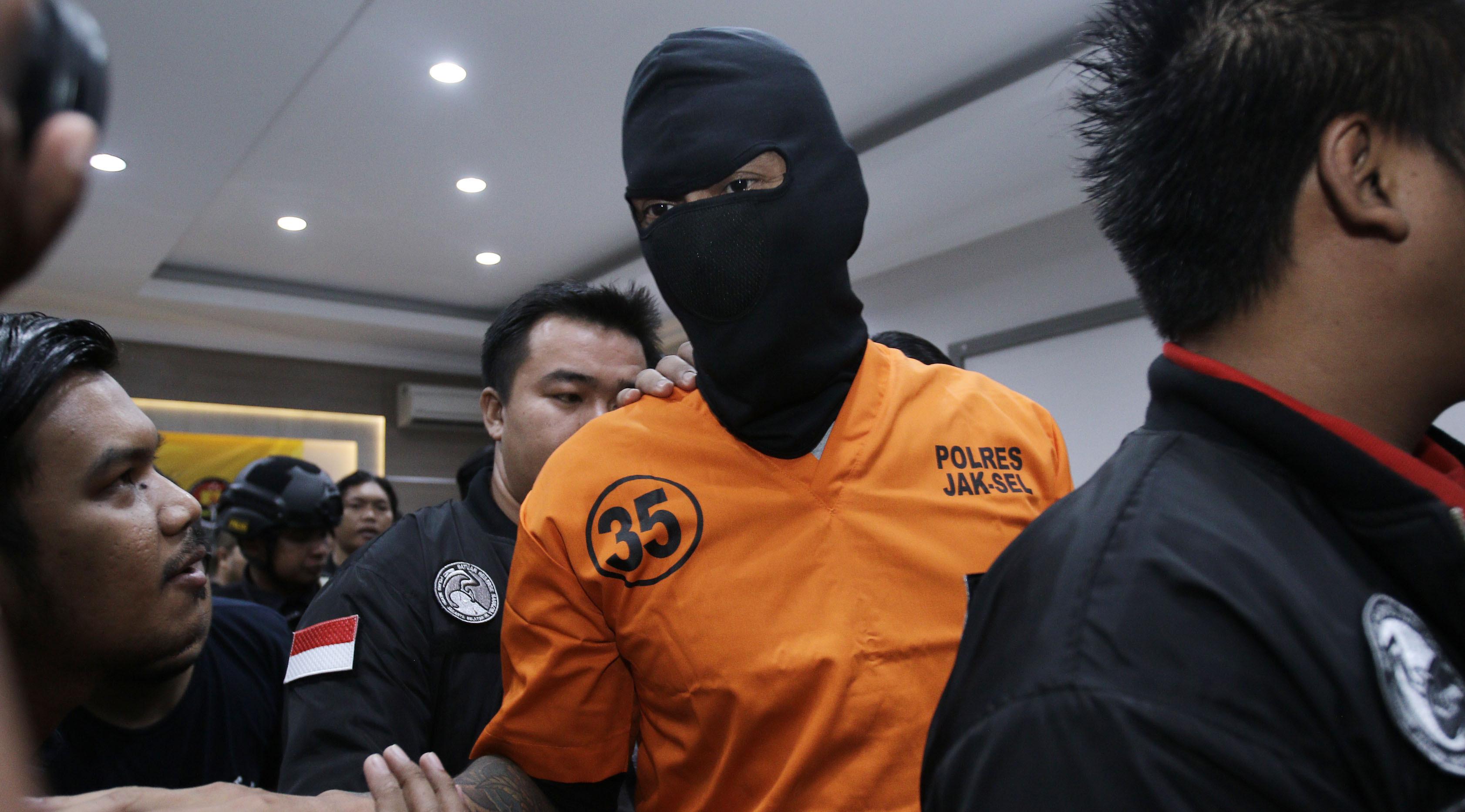 Sekitar pukul 10.10 WIB polisi menghadirkan Tora Sudiro ke hadapan awak media. Mengenakan baju tahanan berwarna oranye, bintang film Warkop DKI Reborn itu memakai masker penutup wajah.
