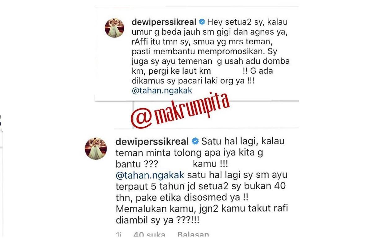 "Hey setua2 sy, kalau umur g beda jauh sm gigi dan agnes ya, raffi itu tmn sy, smua yg mrs teman, pasti membantu mempromosikan. Sy juga sy ayu temenan g usah adu domba km, pergi ke laut km SET*N!! G ada dikamus sy pacari laki org ya!!! @tahan.ngakak," tulis pelantun "Mimpi Manis" itu.