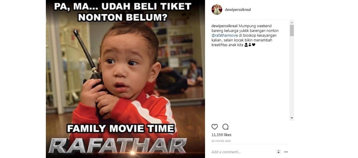 "Mumpung weekend bareng keluarga yukkk barengan nonton @rafatharmovie di bioskop kesayangan kalian.. selain kocak bikin menambah kreatifitas anak kita," tulis mantan istri Saipul Jamil itu sebagai keterangan fotonya.