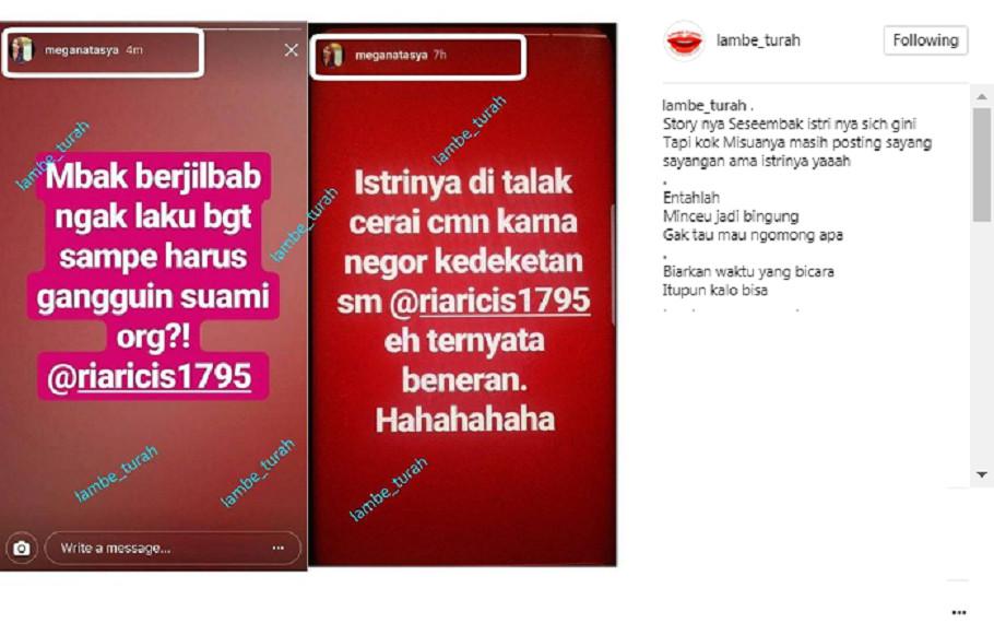 "Mbak berjilbab ngak laku bgt sampe harus gangguin suami org?! @riaricis1795," tulis @meganatasya. "Istrinya di talak cerai cmn karna negor kedekatan sm @riaricis1795 eh ternyata beneran hahaha," lajutnya lagi beberapa saat kemudian.