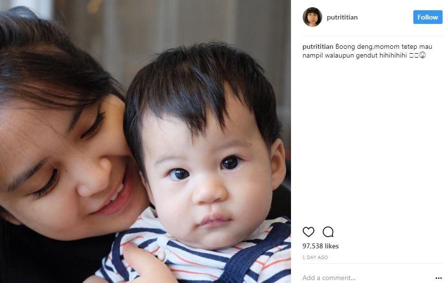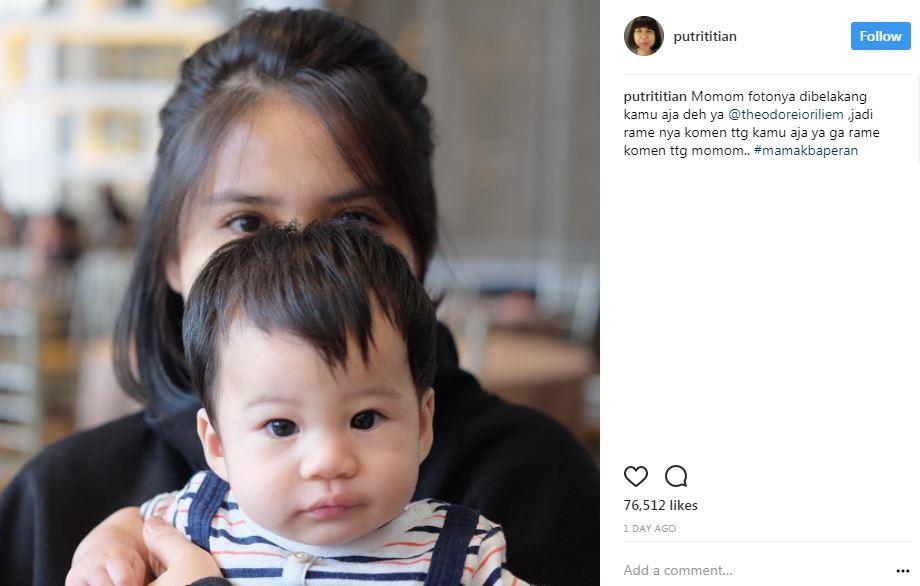 "Momom fotonya dibelakang kamu aja deh ya @theodoreioriliem ,jadi rame nya komen ttg kamu aja ya ga rame komen ttg momom.. #mamakbaperan," tulis Putri Titian dalam keterangan foto yang disukai lebih dari 76 ribu warganet tersebut.