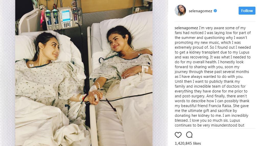 Selena Gomez mengunggah beberapa foto yang menunjukkan bukti tindakan transplantasi tersebut. Dalam foto pertama, Selena Gomez tampak bergandengan dengan sang pendonor di ranjang rumah sakit.