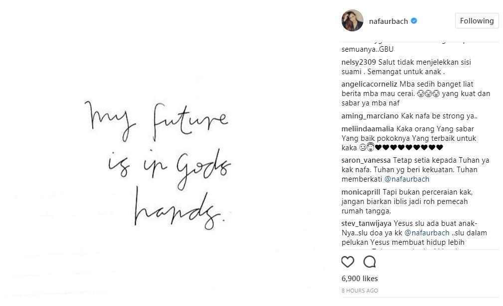Namun, makna sebaliknya terlihat di laman utama Instagram Nafa Urbach. Dalam sebuah foto yang diunggah, Rabu (20/9/2017), ibu satu anak itu justru terlihat pasrah. "Masa depanku di tangan Tuhan," tulis sang artis.