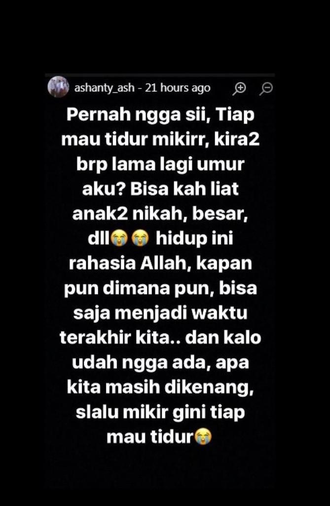 "dan kalo udah ngga ada, apa kita masih dikenang, slalu mikir gini tiap mau tidur," Ashanty menandaskan. Entah apa yang sedang menghantui pikiran sang artis ketika menulis ungkapan tersebut.