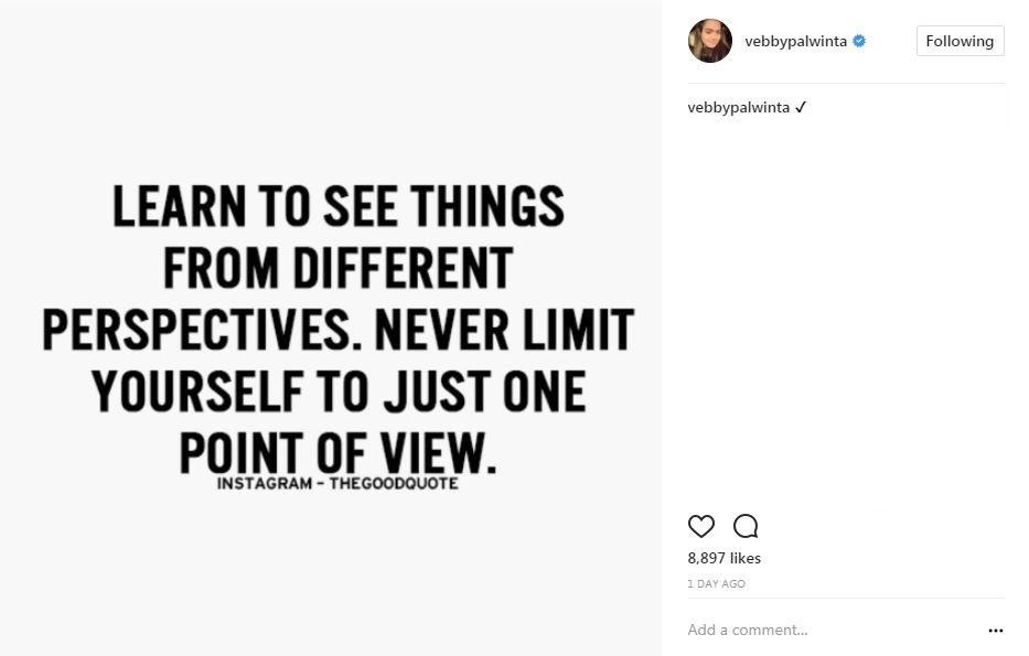 "Learn to see things from different perspectives. Never limit yourself to just one point of view. (Belajar untuk melihat sesuatu dari sudut pandang berbeda. Jangan batasi dirimu untuk melihat hanya dari satu sisi)," begitu tulisan yang diunggah Vebby Palwinta.