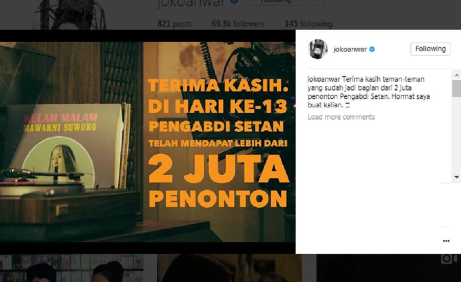 "Terima kasih teman-teman yang sudah jadi bagian dari 2 juta penonton Pengabdi Setan. Hormat saya buat kalian," tulis Joko Anwar di akun Instagram pribadinya, Rabu (11/10/2017).