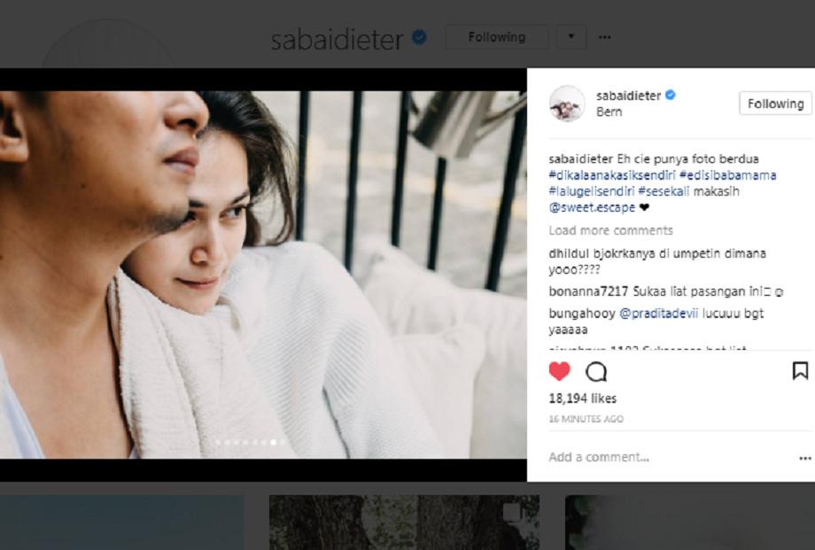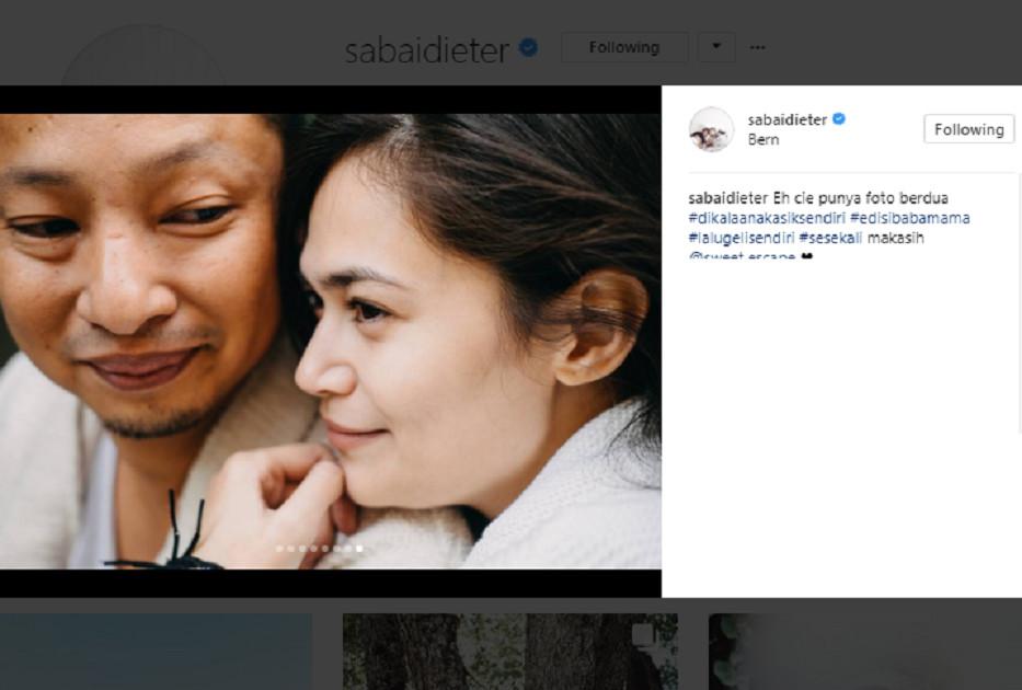 "Eh cie punya foto berdua #dikalaanakasiksendiri #edisibabamama #lalugelisendiri #sesekali makasih @sweet.escape," kata Sabai Morscheck dalam keterangan fotonya, Rabu (18/10/2017).