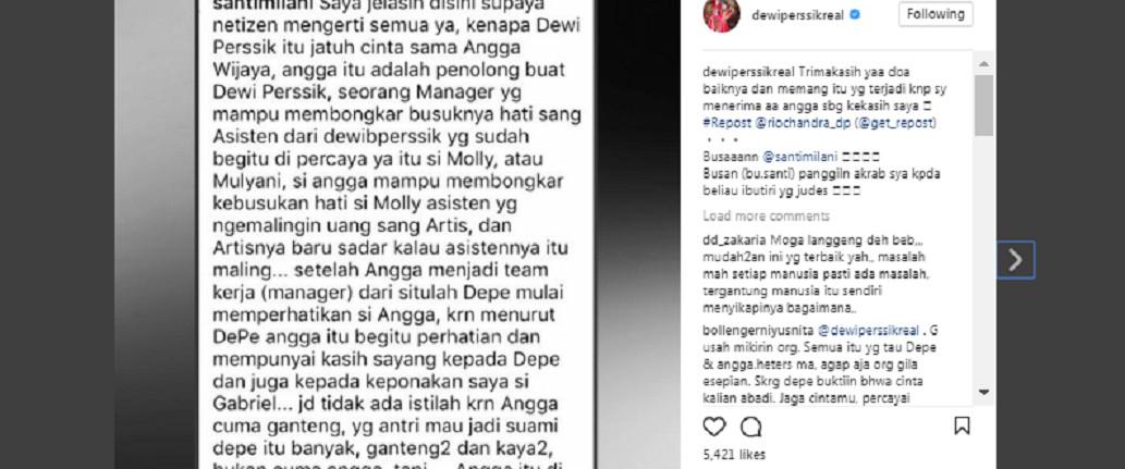 "Angga itu adalah penolong buat Dewi Perssik, seorang manajer yang mampu membongkar busuknya hati sang asisteN yang begitu dipercaya, yaitu si Molly, atau Mulyani. Si Angga mampu membongkar kebusukan hati si Molly asisten yang memalingi uang sang artis," tulis Santi Milani yang diunggah ulang oleh Dewi Perssik, sabtu (21/10/2017).