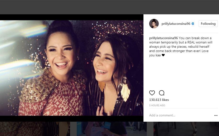 "Kau bisa menghancurkan seorang perempuan untuk sementara, tapi perempuan sejati akan mengumpulkan bagian hatinya yang hancur, membangun kembali dirinya, dan kembali dalam kondisi yang paling kuat," tulis Prilly Latuconsina.