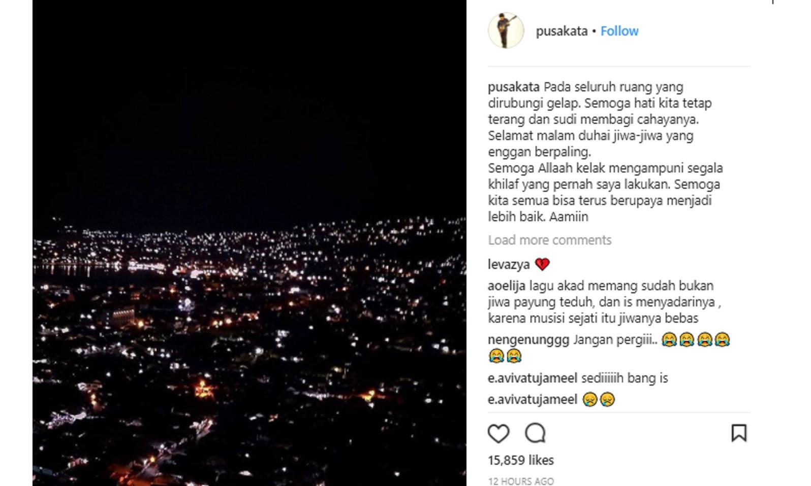 Dalam unggahan pada Rabu (15/11/2017) di akun @pusakata, pelantun "Untuk Perempuan yang Sedang dalam Pelukan" ini membagi sebuah foto kerlip lampu kota di malam hari.