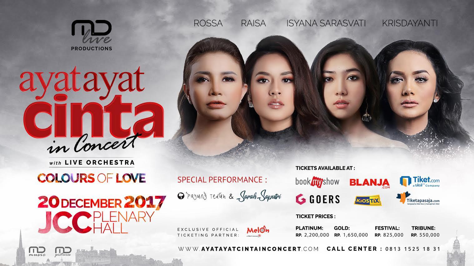 Liputan6.com, Jakarta Selain penayangan sekuel film 'Ayat Ayat Cinta 2', konser musik 'Ayat-Ayat Cinta in Concert' juga menjadi yang paling ditunggu. Empat diva musik Tanah Air seperti Rossa, Raisa, Isyana Sarasvati dan Krisdayanti telah disiapkan MD Live Productions untuk tampil di Plenary Hall Jakarta Convention Center (JCC), Jakarta Selatan, Rabu (20/12/2017).
