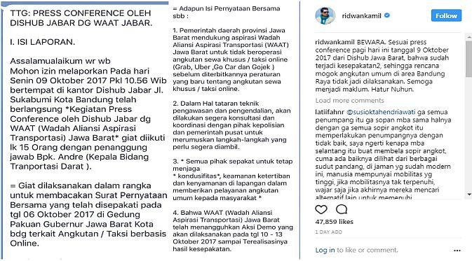 Dalam surat itu, Pemda Jabar menyatakan dukungan terhadap aspirasi WAAT Jabar agar angkutan sewa khusus atau taksi online (Grab, Uber, GoCar dan GoJek) tidak beroperasi sebelum diterbitkannya peraturan yang baru tentang transportasi online.