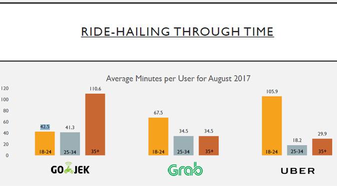 Studi ini mengungkap jumlah pengguna (unique visitor) Grab dan Gojek tidak jauh berbeda (8,6 juta dan 8,8 juta per bulan). Sementara jumlah pengguna Uber sekitar seperempatnya (2,3 juta per bulan).